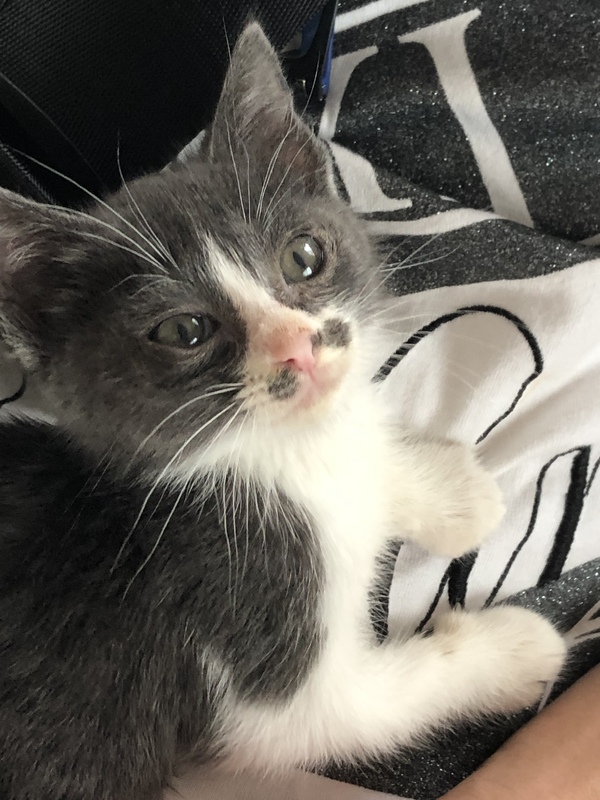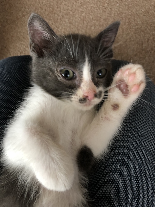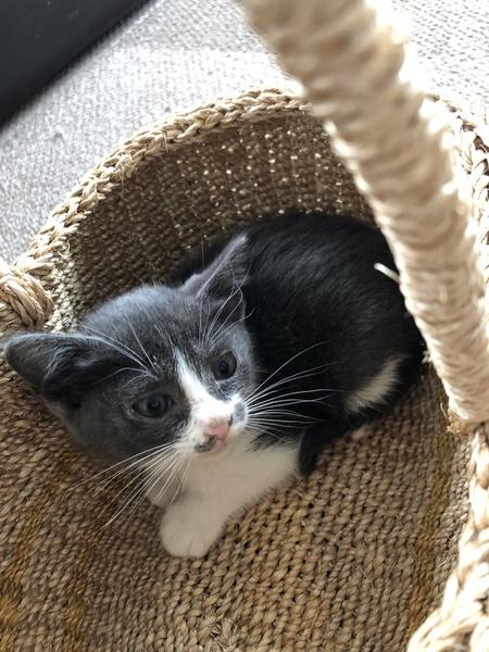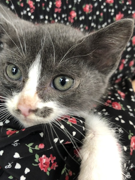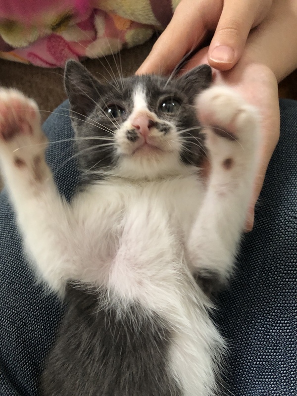 | 特徴(性格など) | 白黒ブチの柄ですが黒い部分が薄い色です。 とても大人しくて、怖がりですが撫でて抱っこするとずっとグルグル声で甘えてきます。 保護してから、日が浅いので隠れてしまうこともありますが、おもちゃで遊んだり子猫らしく可愛いです。 尻尾はまっすぐで長いです。 |