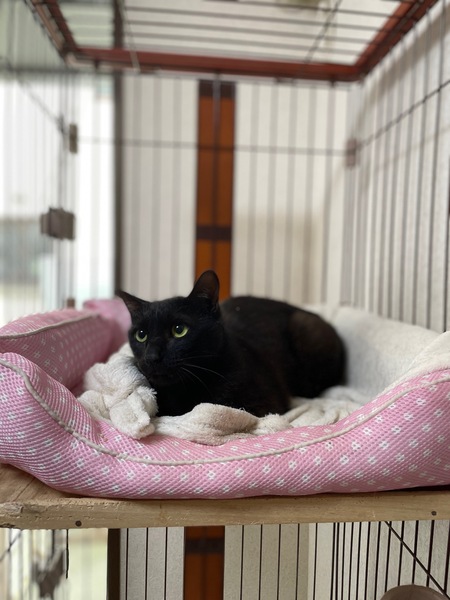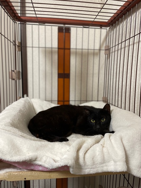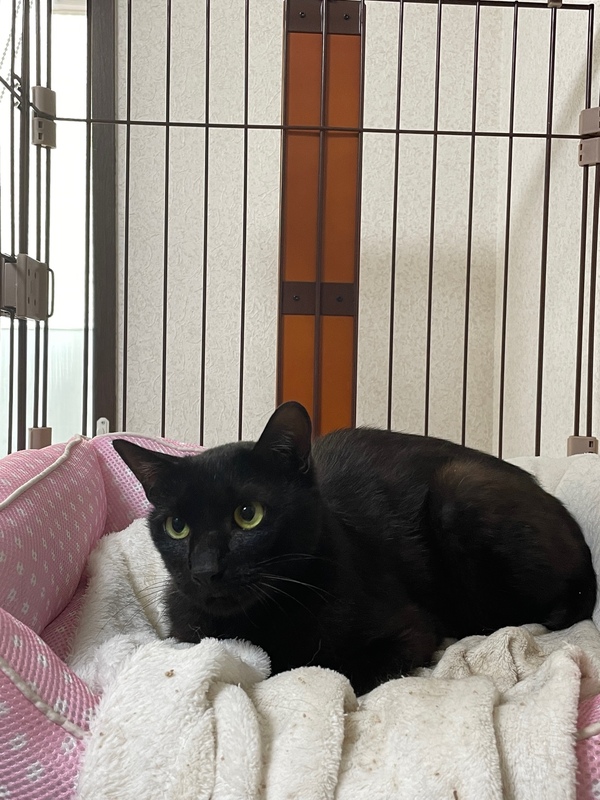 | 特徴(性格など) | 黒猫の男の子で尻尾は10cmくらいの鍵しっぽです 体重は約3.8kgで顔も小さく小柄で可愛い顔をしています 性格は気が小さく少々ビビりなところがあります 他の猫達から虐められていたこともあり、猫を怖がります 人には少しずつ慣れてきていて、撫でたりすることもできます ご飯を食べながらウマウマしゃべるのが可愛いんです フードはドライ、ウエットなど何でも食べてくれてトイレも問題ありません |