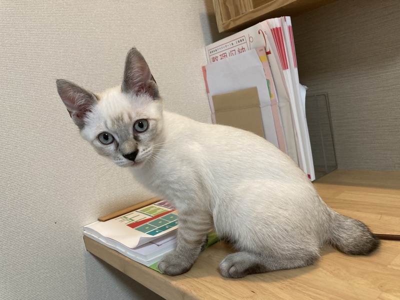 | 特徴(性格など) | シャム風で耳、鼻、尻尾、足先がグレー。足にはうっすらトラ柄があります。 目は薄いブルーです。 手足が少し短めに感じます。 人馴れに時間がかかっていましたが、仲良しだった兄弟猫が先に貰われていったの機に、急に距離が近くなってきました。撫でたり抱っこもできるようになってきたので、あとは時間が解決してくれると思います。猫じゃらしやボール遊びが大好きです。 |