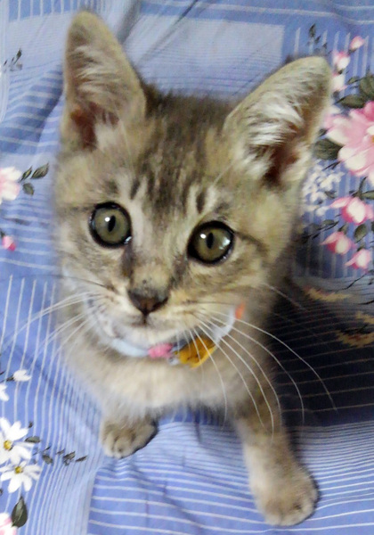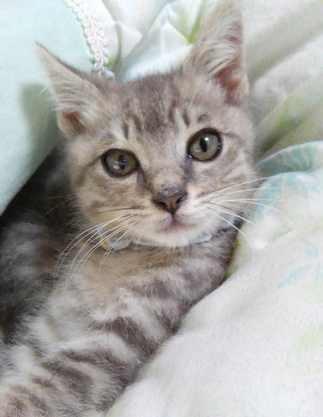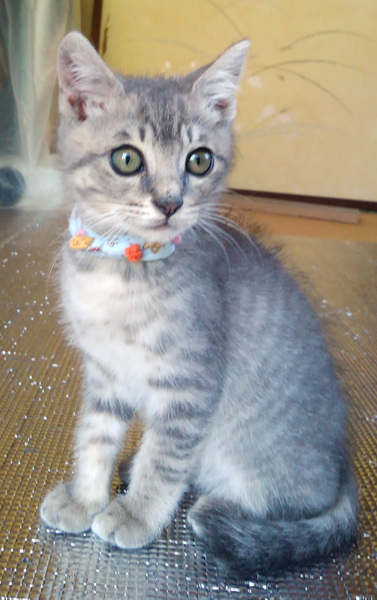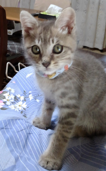 | 特徴(性格など) | とてもよく人馴れしたサバトラ模様のオス子猫です。保護主さん宅の先住成猫とも仲良くしています。 元気食欲あり。3種ワクチン1回目接種済み。猫エイズ白血病検査済み(共に陰性)。寄生虫駆虫・ノミダニ駆除薬投与済み。 |