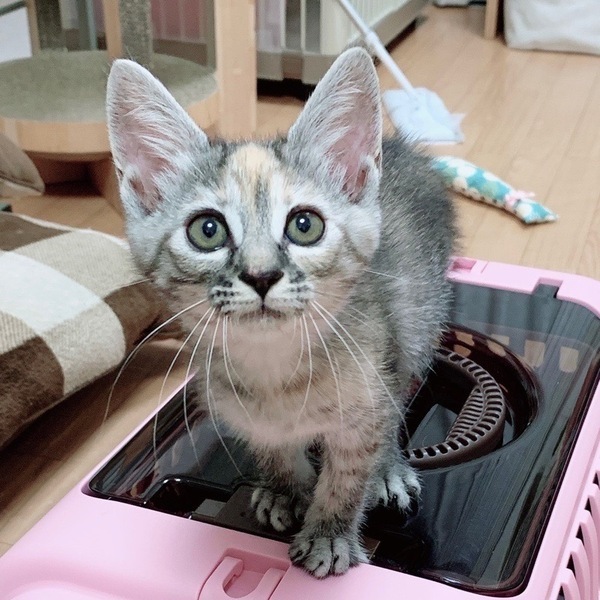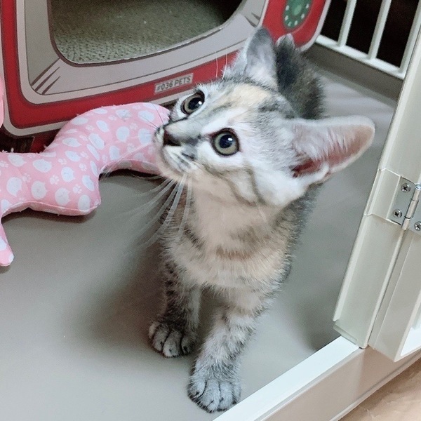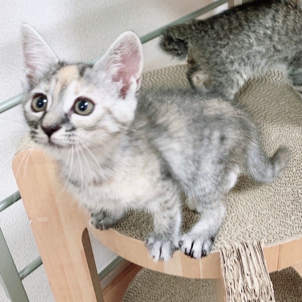 | 特徴(性格など) | ママ猫が出産して、生まれた子猫の中で一番最初に個体把握が出来たのがでこみちゃんでした。おでこにオレンジ色の模様がくっきり。シルバーっぽい色にオレンジ系の縞模様が入った、とても個性的できれいな毛色をしています。 たま子ちゃん同様にとても活発で、いつもにゃんプロをしているか、走っているか、面白いことがないか探しています。トイレ掃除をしていると必ず近くで見守ってくれます(笑) ご飯もウェットフードもかりかりもどちらもよく食べます。 しっぽを膨らませながら欽ちゃん走りをするのが得意(笑)高いところや新しい場所にも果敢にアタックします。 たま子ちゃんとは姉妹です。お転婆さん同士とても仲良しなので、2匹でのお迎えも大歓迎です! また、健康管理・脱走対策はしっかりやっていただきたいと思っております。 対策等でわからないことはアドバイスさせていただきますので、疑問点などは遠慮なく聞いていただきたいです。 |