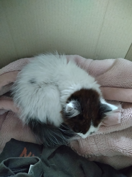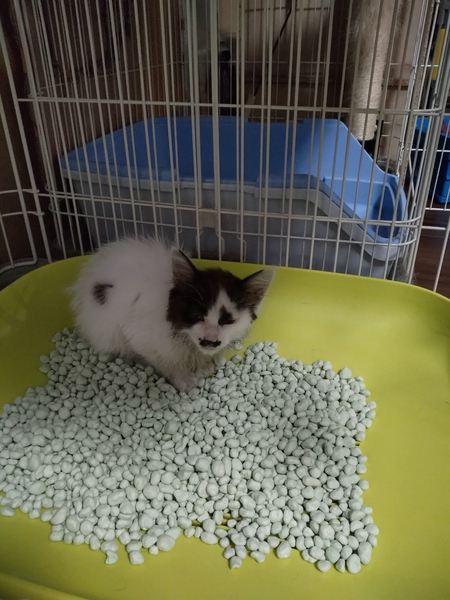 | 特徴(性格など) | とても人懐っこい性格です。(乗車10分の車内で爆睡、出会って10分も立たない筆者の膝上でくつろぐなど) 白のベースに茶色の模様があります |
