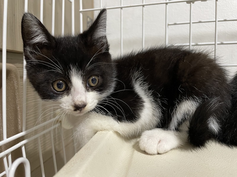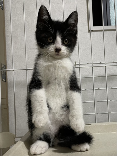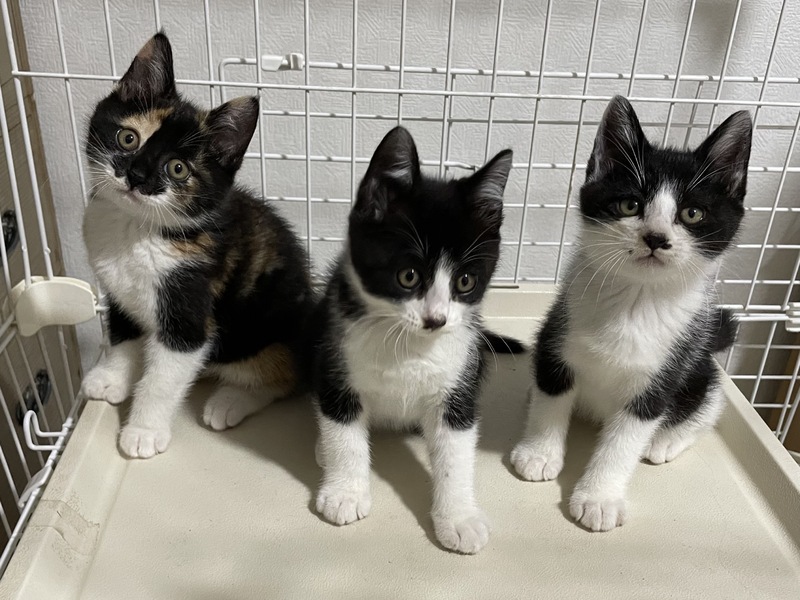 | 特徴(性格など) | ミケ:女の子ですが、度胸があり、1番適応能力が高そうです。 白黒(口元にほくろの様な模様がある方):とにかく元気いっぱいの男の子で、おもちゃを振るといの一番に飛んできて全力で遊びます。 白黒:慎重派の男の子。何をするにも様子を見ながら1番最後に参加しますが、遊びのスイッチが入ると沢山遊んでくれます。 |