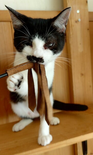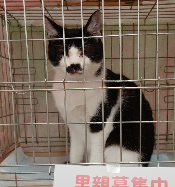 | 特徴(性格など) | 白黒ハチワレの女の子です。 しっぽはスッと長いです。 マイペースな性格で、ボール遊びを好んでいます。他の猫にあまり興味を示しません。複数飼育可能です。 保護した時にかかっていた猫風邪の影響で両目が見えませんが、棚の上まで自分で登ってしまうほどのおてんばなお嬢さまです。日常生活での介助は不要です。 |