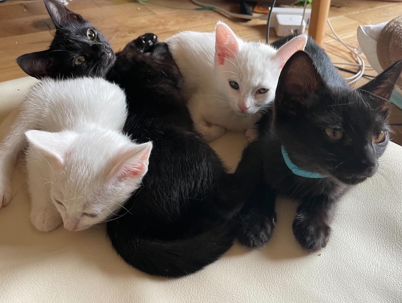 | 特徴(性格など) | きれいな真っ黒の猫さんです。 水色の首輪:オスのワルツ君、 赤色の首輪:メスのどれみちゃん 人慣れ抜群で、猫とも、人とも仲良くできる上に、ベッタベタのスリゴロです。 遊ぶこと、食べることが大好きです。猫じゃらしを振ると全力で遊びます。 ウイルス検査にてエイズ陽性が出ましたが、母体からの影響と思われます。おそらく生後6か月時点で再検査をしたら陰性になる可能性も高いです。 リンゴ猫(エイズ陽性猫)ですが、発症しない可能性もとても高く、20年以上生きる猫もたくさんいます。リンゴ猫さんにご理解のあるご家庭にお願いいたします。 また、この子は特に身体が丈夫で、同居猫が風邪をひいてもうつらないほどに免疫力もとても高いです。 1匹飼育でも、同じ写真に写っている白猫の男の子のアメくん・ルッコラくんと一緒でも大丈夫です。 誰とでも仲良くできるので先住のいるご家庭でも大丈夫です |