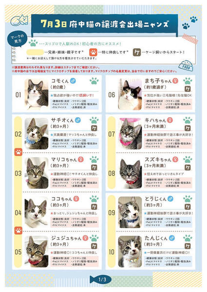 | 里親募集する理由 | 個人、自治会、商店街、市役所から依頼されTNRに入った現場でrescueした猫の内、子猫ちゃんを中心に里親様を募集しています。 ※活動内容や、里親さまからの心温まるお便りを載せているので、当会のBlogも是非ごらんください。 https://chuneko.exblog.jp/ ※Twitter、FaceBook、 Instagram、Youyube始めました! [NPO法人 府中猫の会]で検索! |