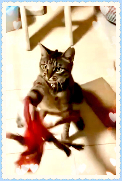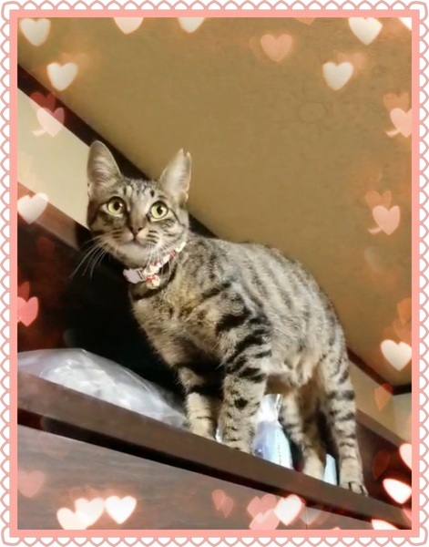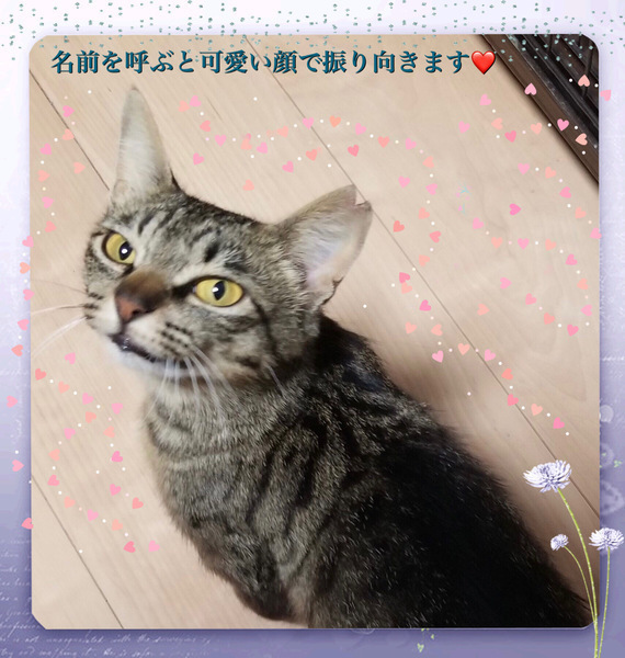 | 特徴(性格など) | 人懐こくて名前を呼ぶと必ず来ます。 誰にでも、初めての人にも近寄ってスリスリ。撫でてくださいと甘えます。とっても可愛い女の子です❤️ 猫にも友好的で鼻を合わせてご挨拶します。 ケンカはしません。 さっと引くので多頭飼いも大丈夫ですが、遠慮する子なのでできれば1匹飼いが理想的かと思います。 室内も荒らさず、鳴かない静かな飼いやすい猫ちゃんです。 走り回ったりタワーに駆け上ったりすることはあまりしませんが、ネズミや羽根のおもちゃで遊ぶと野生の血が騒ぐらしく活発にじゃれつきます。 ブラッシングが大好き。うっとりしてお腹を見せます(^^) 小柄でしなやかな身体つきに細い長い尻尾が特徴的です。 頭も顔も小さく目が大きくてエキゾチックな顔立ち。 大きな目は金色で見た目は野性的です。 ベンガルのようにクッキリしたキジ柄がワイルド❤️ https://youtube.com/shorts/TxnFZWu6L_s?feature=share |