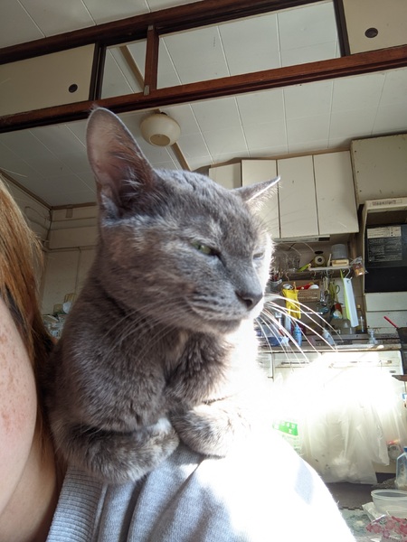 | 特徴(性格など) | 名前はシュン 色は全体的に灰色でまばらに茶色、首のところに白色です。 性格はおとなしくてクール。少し人見知りなところもありますが、甘えん坊です。あと少し潔癖症なところもあります。 高い所が大好きで、運動神経抜群です。 |