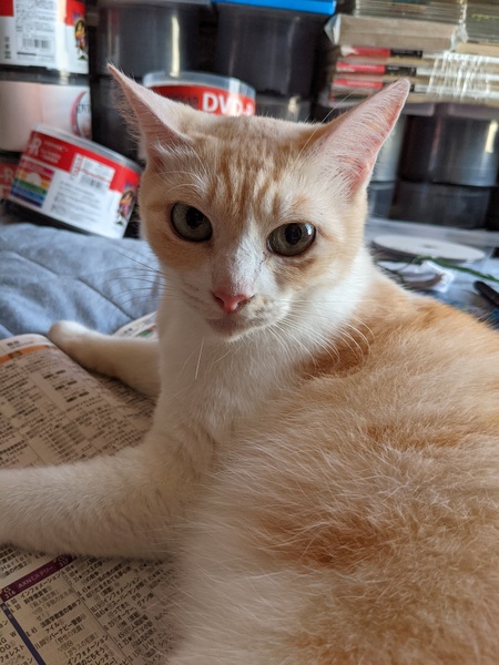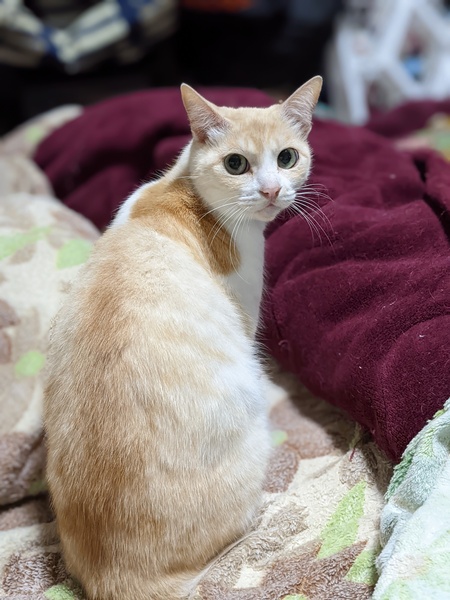 | 特徴(性格など) | 名前はタマゴ 色は茶色と白色です。生後1週間ぐらいの頃に、川の近くで捨てられていた保護猫です。 性格は少し人見知りですが、とても甘えん坊です。 感受性豊かな子で、よく会話を聞いてくれて、妹猫ちゃんの面倒もみてくれる優しい子です。 人間の布団で一緒に寝るのが大好きで、食べ物も好き嫌いせずなんでも食べてくれます。 |