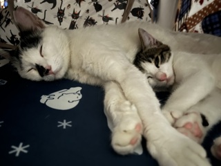 | 特徴(性格など) | どちらも黒っぽい模様が入っています。 左の子、少しお腹が出臍みたいになっていて、臍ヘルニアの可能性があります。生後半年までに自然治癒することもありますが、去勢避妊手術をする際に+数千円で一緒に取ってくれる病院もあるみたいです。こちらの子はすごく人懐っこくてご飯をよく食べています。 右の子は、片腕の毛が少し生えていない部分があるみたいです。こちらの子は少しシャイなのか部屋の隅に隠れたりしています。 |