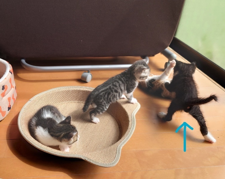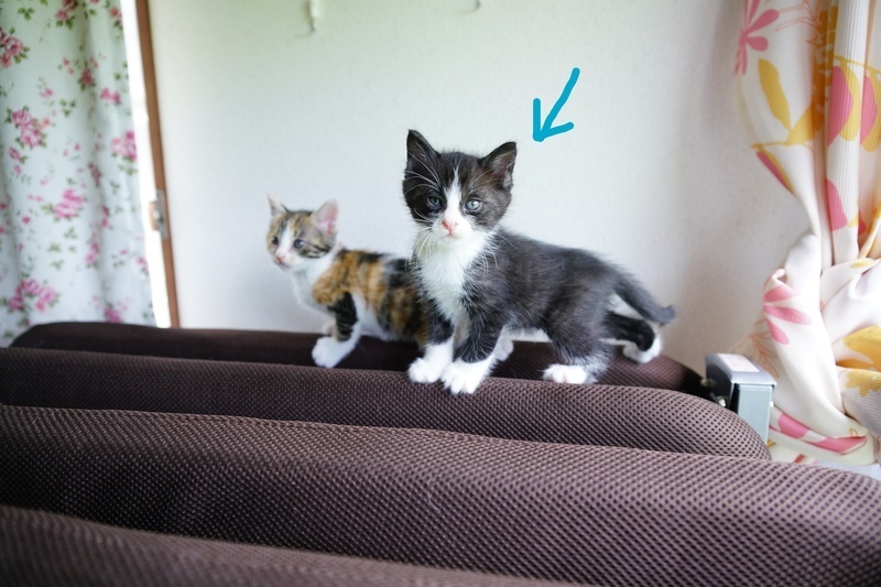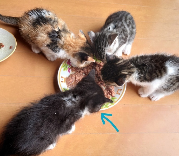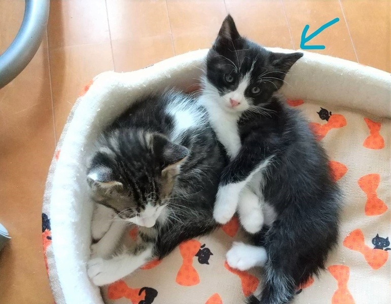 | 特徴(性格など) | きれいなハチワレでおヒゲと足先は白です。 尻尾は長くて先っぽだけ鍵になっています。 兄妹で元気に飛び跳ねながら遊んでいます。 早目に保護したのでみんな人馴れしています。 |