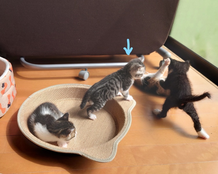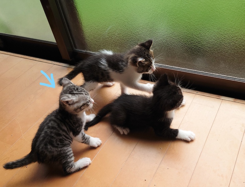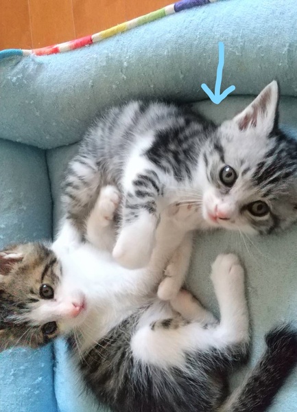 | 特徴(性格など) | アメショーのようなくっきりした縞模様。 尻尾はちょっと短めまっすぐです。 兄妹で元気に飛び跳ねながら遊んでいます。 早目に保護したのでみんな人馴れしています。 |