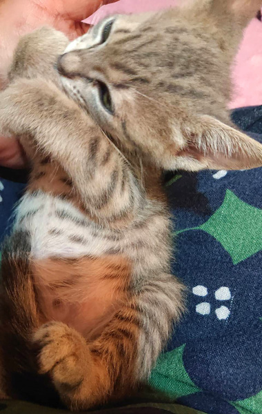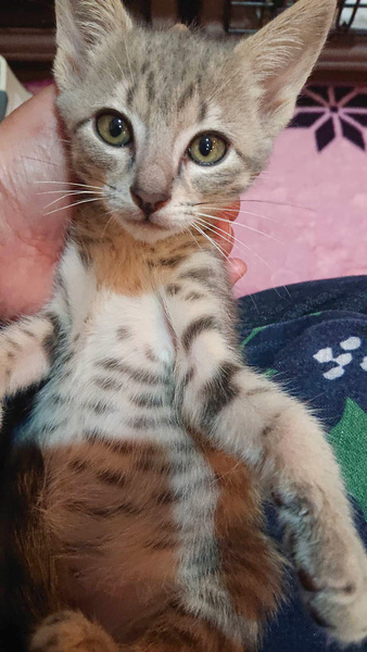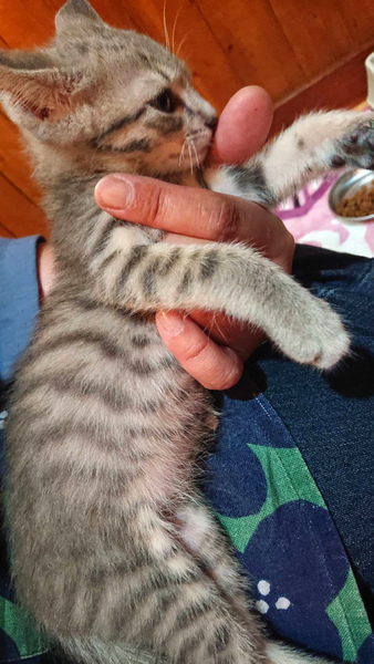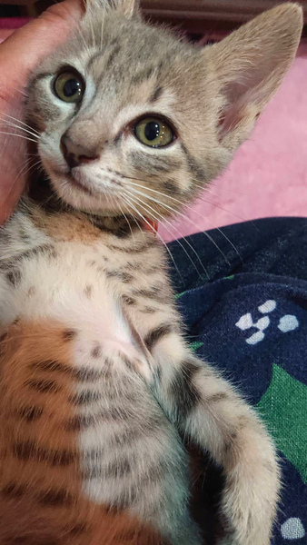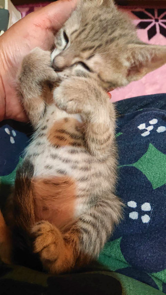 | 特徴(性格など) | お腹にまで模様があって可愛らしいサバトラの男の子です。 授乳で育てたので、とても人懐っこいです♪ エイズ白血病陰性 ワクチン2回済み・駆虫済み・マイクロチップ挿入済みです。 |