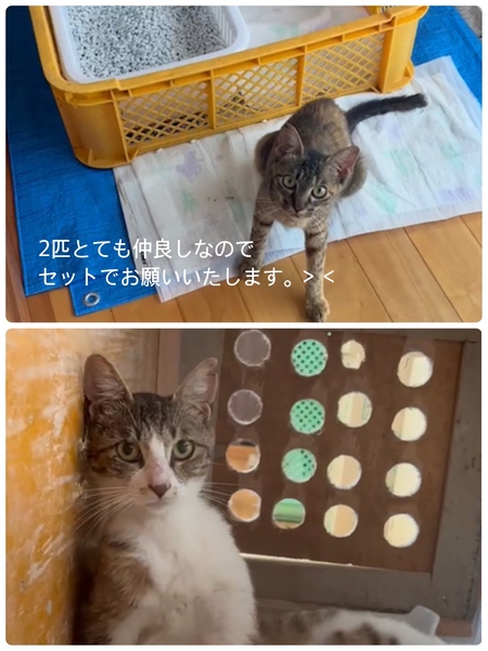 1匹はキジトラ風の猫さんです。 もう1匹は白とキジが混ざった猫さんです。 2匹とも美人猫でとても可愛い顔をしていますよ♫(*ˊ-ˋ*) どちらも女の子です。 多分まだ2歳にはなってかいかと思います。 2匹とても仲が良くいっつも一緒にいます。 キジトラ風猫さんはとても懐いていて よく遊んでと甘えてきます★ 白猫さんの方は捕獲した時に 警戒心が芽生えてしまったようで 警戒心強めです。 最初の方はすりすりしてきたり 甘えてきたので慣れたら大丈夫かと思います。 最初は放っておくつもりでしたが 可愛くて放っておけず... せめて不幸な子猫を増やさないため、 この子達が身軽にずっと生きていけるように 避妊手術をしてあります。 リリースする予定だったため さくら耳カットしております。 しかし懐いてきてあまりに可愛くて リリースしても餌を食べていけるか... 暑い夏乗り越えていけるか... 不安ばかりでやはり里親さんを募集したいと 思いました。 |