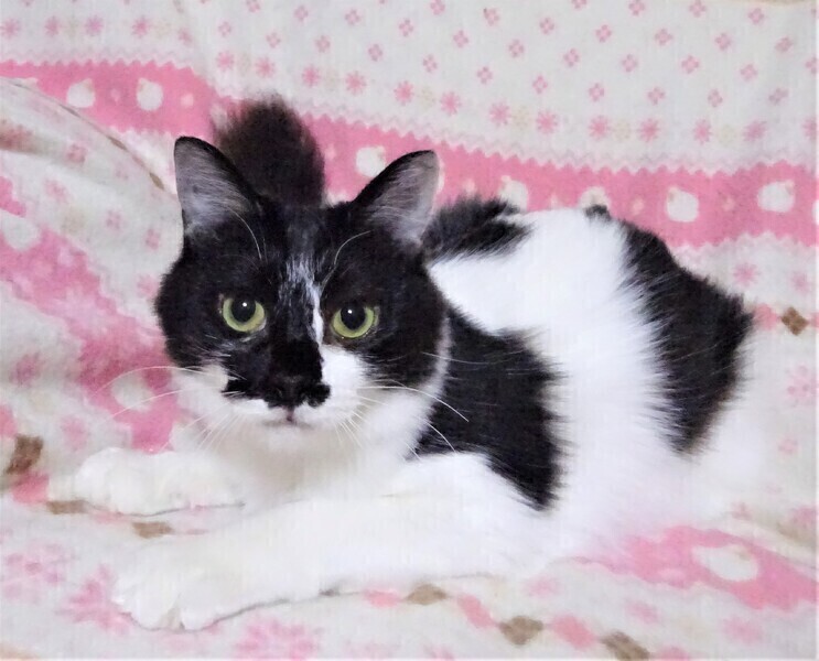 | 特徴(性格など) | 仮名: 桃葉ちゃん(メス) 毛色: 長毛の白黒、尻尾長い 性格: ミルク育ちなので人馴れしています。 ご飯の時や遊びに出る時など、一歩遅れる感じですから、のんびりなのかもしれません。 小柄で、動きも早くなく、探検ものんびりする感じです。 抱っこすると甘えたりしますが、今は探検の方が忙しくじっとしていない感じです。 最近では、そっと傍に来て、そっと撫でて~という感じなので、撫でてあげると控えめに喜んでいます。 姉妹の桃子ちゃんと一緒が希望ですが、大きくなったので一匹でも可能です。 大人猫とも子猫ともうまく付き合えています。 猫飼い初心者の方でも大丈夫と思いますし、先住猫がいるお家でも大丈夫と思います。 検便済 駆虫済 ノミ取り済 ワクチン済 避妊手術済 猫エイズ・白血病ウィルス検査はともに陰性 |
