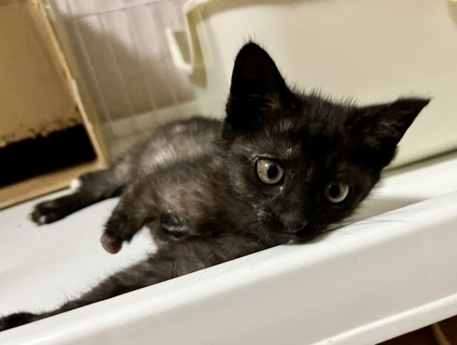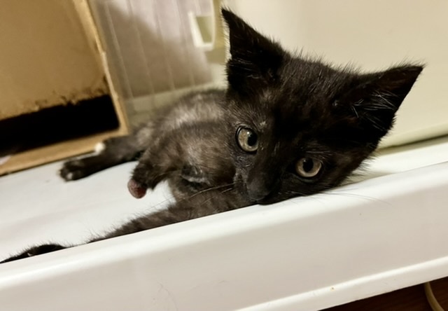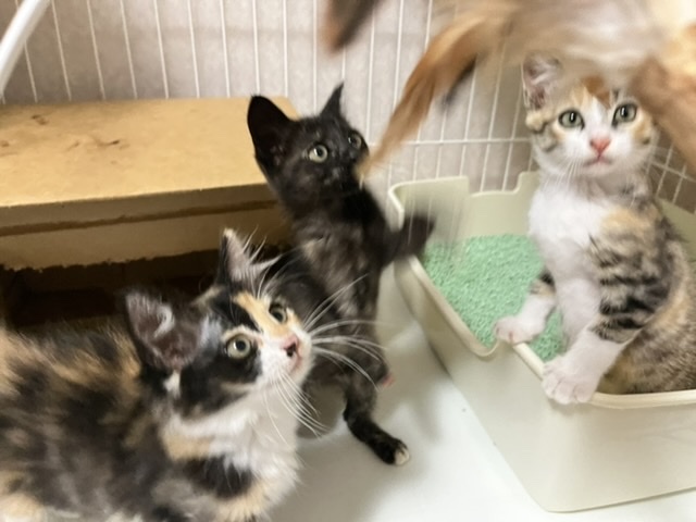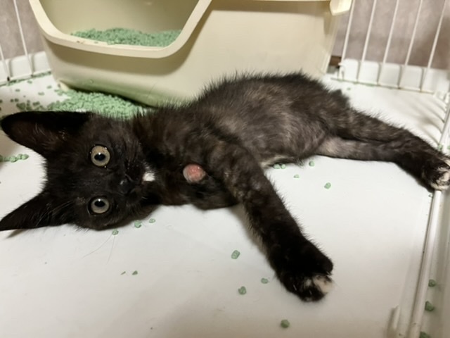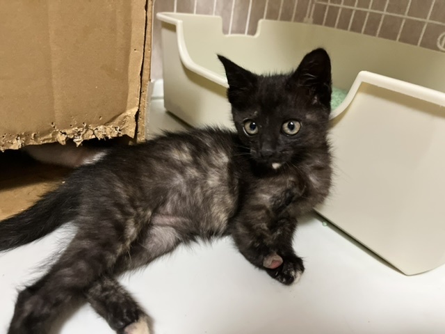 | 特徴(性格など) | めも << 前へ | 次へ >> サビ猫の女の子。 生後2ヶ月。 毛色:トーティシェルスモーク やぶ蚊がたくさんいる場所に置かれた小さな檻に雨の日も暑い日も閉じ込められ、暮らしていた姉妹のうちの1匹です。 腕が網に絡まり、切断されてしまったようです。 病院にも連れて行ってもらえませんでしたが、なんとか生き残った奇跡の子。 ケガの影響か、兄弟たちに比べて体のサイズがとても小さいです。 生後2ヶ月ですが、生後1ヶ月くらいに見えます。 それでも、元気と甘えん坊パワーは猫1倍! みぃー!と声を張り上げ、しっぽを立てて甘えてくれます。 かる~い甘噛みでじゃれたり、ゴロゴロと喉を鳴らして甘えたり、とにかく可愛いです。 体が小さいためか、他の大きな兄弟には負け気味ですが、 おもちゃを振ると、もう無い腕も使って一生懸命じゃれてきます。 その様子がとても可愛らしく、切なくて涙が出そうになります。 3本足の上、体が小さいためか、なかなかケージの上の段に登れませんが 毎日果敢にチャレンジしています。 賢い子で、おトイレも問題なくできますし、他の猫とも仲良くできます。 【行った医療行為など】 ノミダニ駆除、傷の消毒等 ハンデを吹き飛ばすくらい可愛く、元気いっぱいなサビちゃんを 家族として受け入れていただけませんか? ご応募お待ちしております。 |