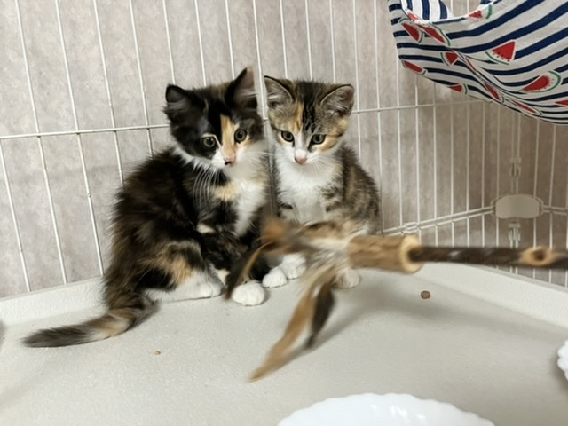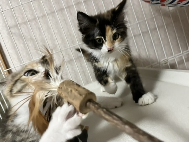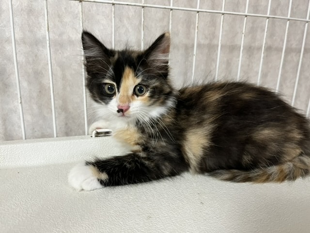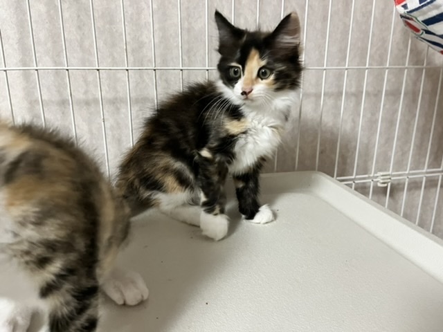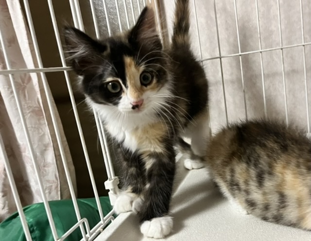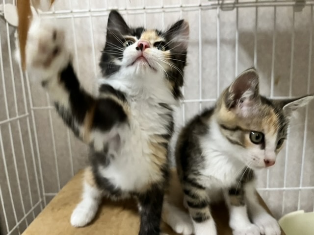 | 特徴(性格など) | ◎Twitterで、子猫達の様子を発信しています。ぜひ覗いてみてください。 https://twitter.com/rai_pasta ◎やぶ蚊がたくさんいる場所に置かれた小さな檻に、雨の日も暑い日も閉じ込められ、暮らしていた姉妹のうちの1匹です。 黒が多い長毛の三毛猫です。 女の子。 顔の形や足の大きさなど、洋猫譲りです。 毛はとても柔らかくて長く、抱っこするとフワフワの毛が気持ちいいです。 脚が太くて大きく、肉球も大きいのでそこそこ大きく育ちそうです。 ノルウェージャンやメインクーン系のMIXに見えます。 【性格】 姉妹の中で一番びびりで慎重派。 ですが、根っこは天然系だと思います。 撫でさせてくれますが、まだ固まります。 おもちゃを振ると夢中になって遊びますが、抱っこされると「はっ!?な、なななに!?」という反応をして、シャー!と軽く威嚇します。 引っ掻いたりはしないのでされるがままではありますが(笑) 撫でられるのはまんざらでもなさそうです。 他の姉妹達は、おもちゃの気配を感じるとすぐ反応するのですが、 この子はワンテンポ遅いような気がします。 そんなところが可愛いです。 毛で膨らんでいるので大きく見えますが、実はそんなに重くないです。 是非一度この子のほわほわな身体を抱っこしていただきたいです。 仲良し姉妹なので、姉妹の誰かと一緒のお家に行けたら嬉しく思います。 【行った医療行為など】 ノミダニ駆除 猫エイズ・白血病は、まだ検査結果がきちんと出ない月齢の為行っておりません。 里親希望者様からご希望あれば実施します。 |