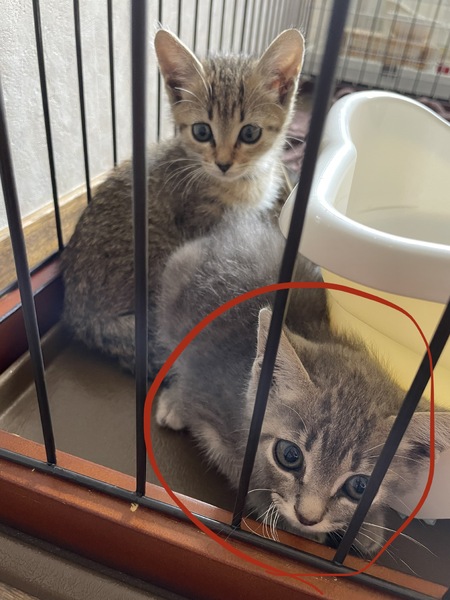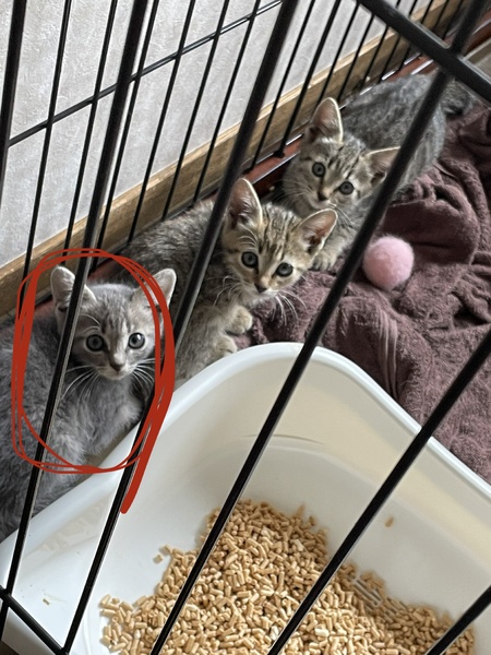 | 特徴(性格など) | グレーでふわふわの毛です。 獣医さん曰く長毛な子になるかもとのことでした。 元気で子猫同士よく遊んでいます。 抱っこや撫でたり出来ます。 ノミダニ駆虫済み。 検便異常なし。 |