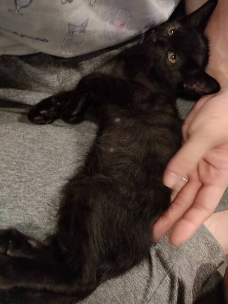| 特徴(性格など) | 全身真っ黒でとても人懐っこいです。 足長でしっぽも少し長く、先っぽが曲がっています。骨折ではなく生まれつきのものです。 撫でるとお腹を出します。 |