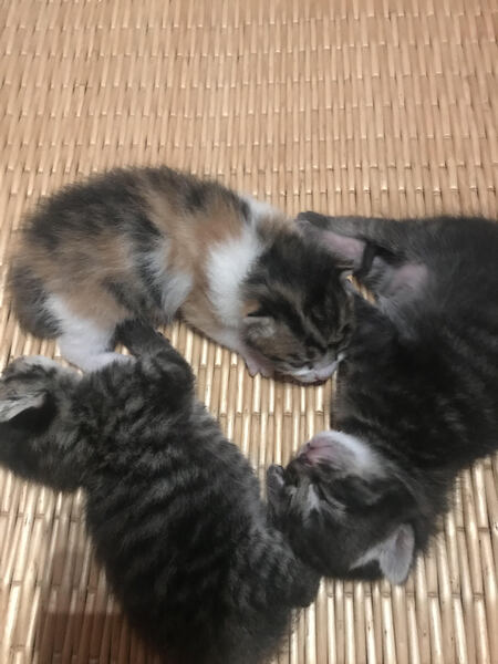 | 特徴(性格など) | 三毛とトラとキジトラ 性別不明です お母さんのおっぱいをいっぱいのんで寝てます 授乳期間が8月末位にお渡し出来ます。詳しくは連絡をください。 |