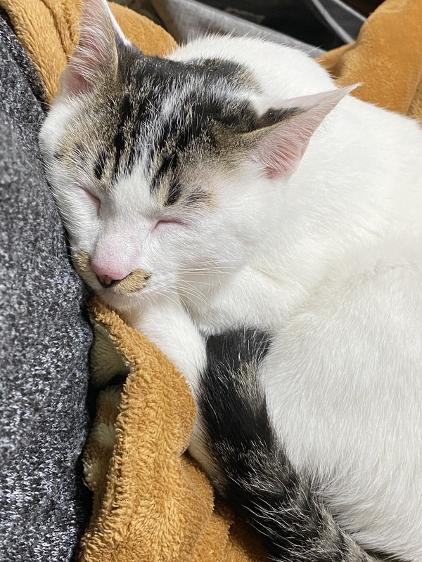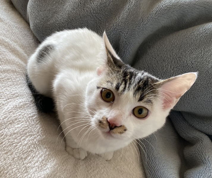 | 特徴(性格など) | 全体が白で頭や尻尾に柄の入った子です 好奇心旺盛で色んなところに登ります ヤンチャな子ですが、慣れた人には甘えん坊で膝の上で寝たりします 段ボールの爪研ぎを無視して布製家具で爪研ぎをするちょっと困ったところもあります トイレは綺麗にしておけば他ですることはありません |