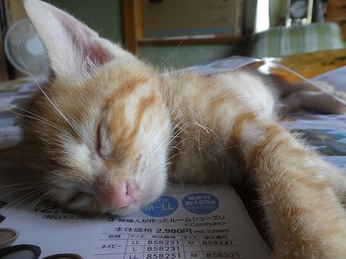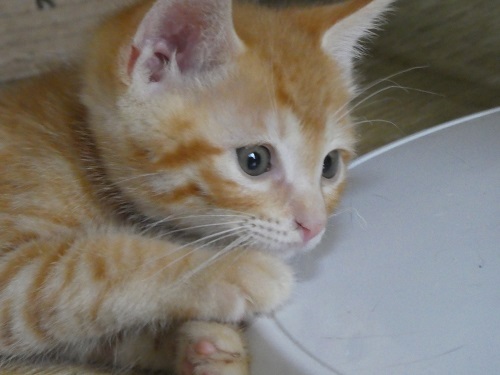 | 特徴(性格など) | 茶トラの男の子。人馴れバッチリ、他の猫にもフレンドリーです。食欲旺盛でいつも完食しています。 ご飯の後はネコじゃらしで遊んだり走り回ったりして、気がつくとコテッと寝てるのが可愛いです。 世話をしている人の後をちょろちょろついて回る可愛い子。寂しがり屋さんなので一緒に遊んでくれる歳の近い先住猫さんがいてくれたらいいかも・・・と思います。 |