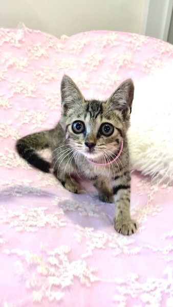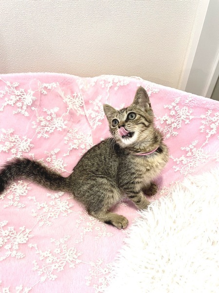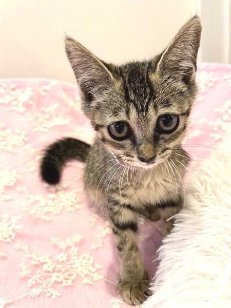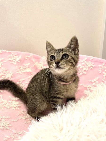 | 特徴(性格など) | キジトラの女の子。 こぼれ落ちそうなウルウルのおめめがとてもかわいいです! 人馴れしており、抱っこも大好きな甘えん坊です。 |