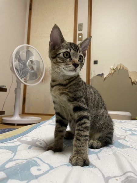 | 特徴(性格など) | 垂れ目の男の子です! 尻尾が少し太く、若干短いです。 4匹の兄弟の中で一番大きいです。 兄弟の中でももっとも早くに人慣れし、現在最も人懐こい子です。 撫でるとゴロゴロいって喜びます。 おもちゃでよく遊び、ご飯も大変よく食べます。 |