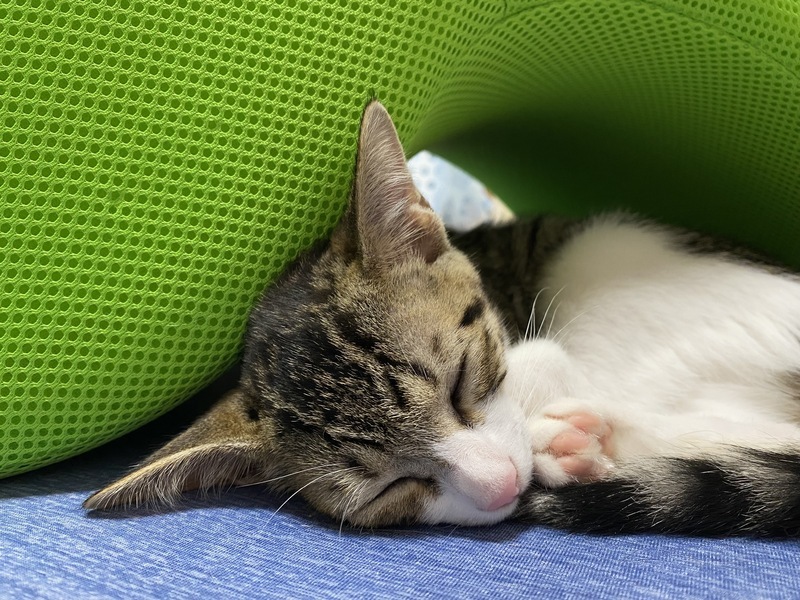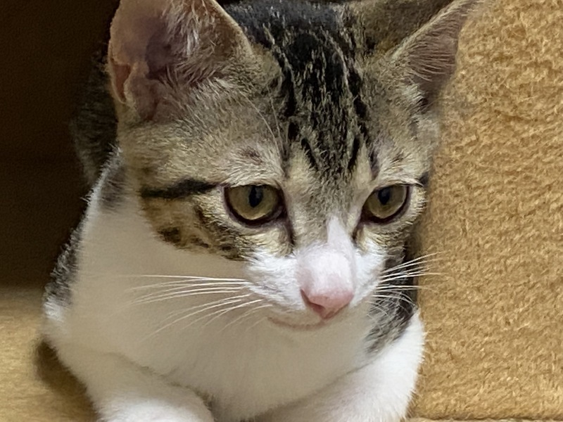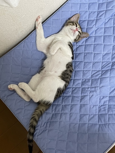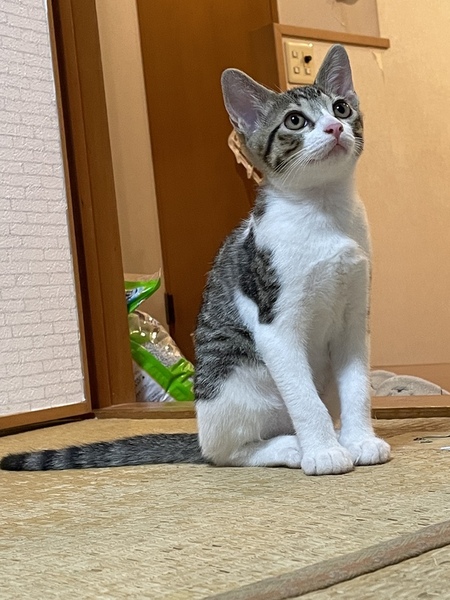 | 特徴(性格など) | 柄は写真を見ていただくとわかりますが、白が基調でキジ柄?が入った感じの柄になります。 尻尾は細長いです。 おてんばですごい元気に遊びます。 猫じゃらしを揺らすとジャンプしたり、立ち上がってそのまま後ろや横にこてん、と倒れることも。 窓際や広い場所に伸びて寝たり、とにかく自由奔放のおてんばさんです。 |