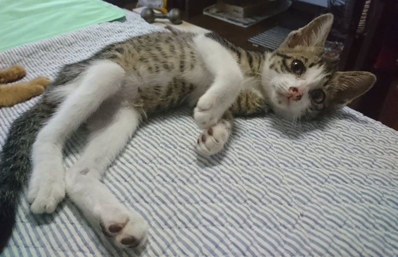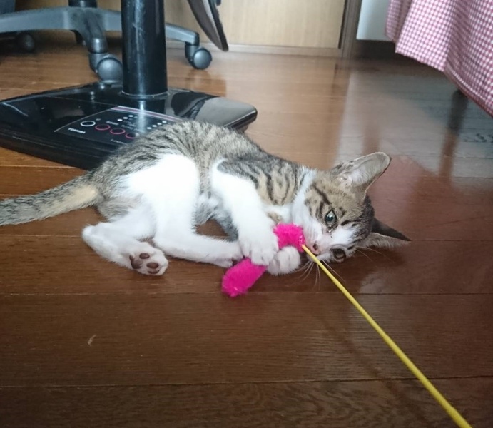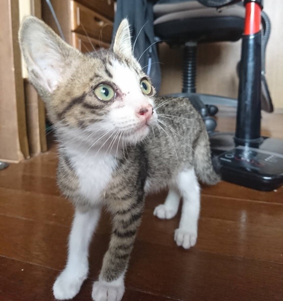 | 特徴(性格など) | 【色柄】キジ白 【特徴】手足長め、尻尾真っすぐで長め 【性格】甘えん坊、大人しい 保護当初は相当お腹を減らしていたのか、トイレ用の砂すら食べようとしていましたが、現在は活発に遊びまわるほど回復しております。 |