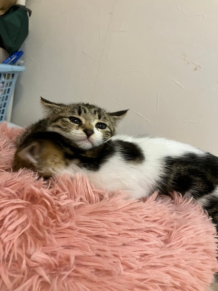 | 特徴(性格など) | むくっとした顔つきが可愛らしいキジシロちゃんです。 シャイでケージの隅っこに寄ってしまうこともありますが、同じ子猫ちゃんには甘えていていつもくっついて遊んでいます♪ 先住猫ちゃんがいるお家や 同じ子猫ちゃんと引き取り&いるお家、 たくさん触れてあげれる方だと良いと思います◎ FF陰性 フロントラインスプレー実施済 検便虫卵なし |