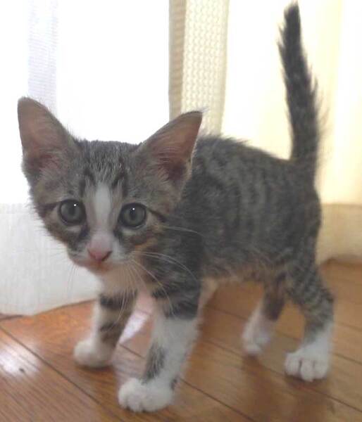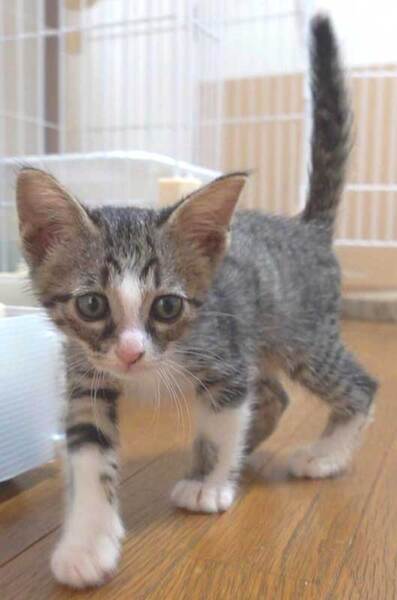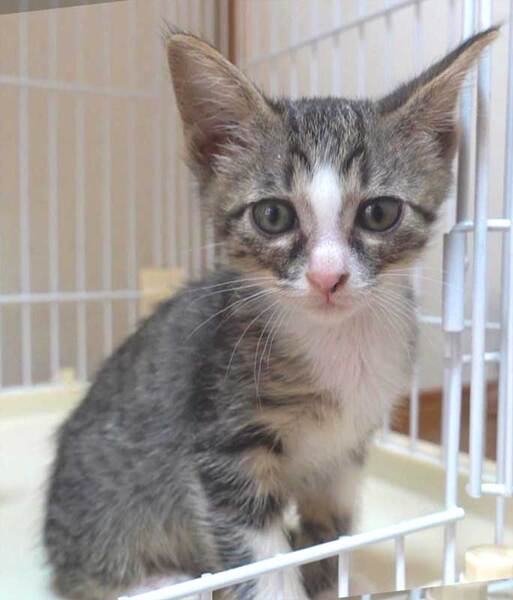 | 特徴(性格など) | 大変かわいらしいキジ白の子猫の鼻ピンクの男の子です。 人馴れしています。 好奇心旺盛で元気です。 是非シェルターにお越しください。 |