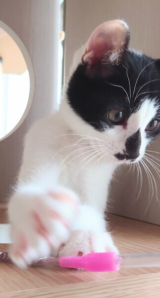| 特徴(性格など) | マイペースがモットー。 兄妹の女子3匹に押されて、ご飯もお膝も譲っちゃいます。 でも、遊びになると負けてません。 元気よく走り回ってずっこけて。 不思議三枚目キャラです。 抱っこもでき、お膝にも乗ってきます。 産まれて1週間程で保護している為か、 人間に対する恐怖心もなく、里親会でもへそ天で寝れるほど。 新しいおうちに慣れるのも早いと思います。 |