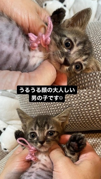 | 特徴(性格など) | 近日駆虫予定 ウルウルおめめのおっとりな男の子です。 小さい体ですが優しさは一番大きいかも! ゆったりまったりが大好きな子です 皆より少しだけ成長が遅かったけど、もう少しで追い付きそうです! ※沢山の兄弟と過ごしてきた子なので出来れば兄弟で飼ってくれる方優先でお願いしたいです。 |