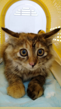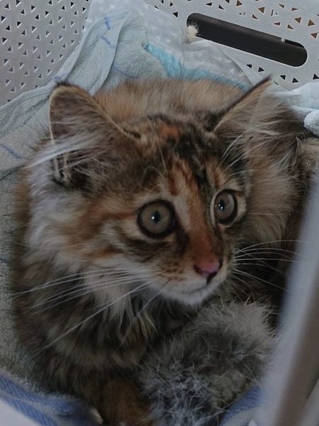 | 特徴(性格など) | 長毛の綺麗なサビ柄の女の子です。 おっとりしてる様な感じです。 肉球が左右違います。 |