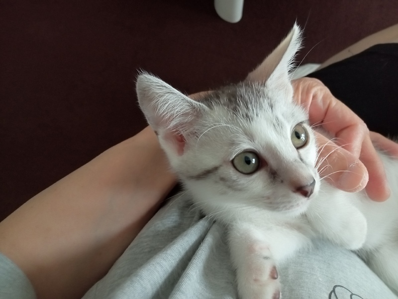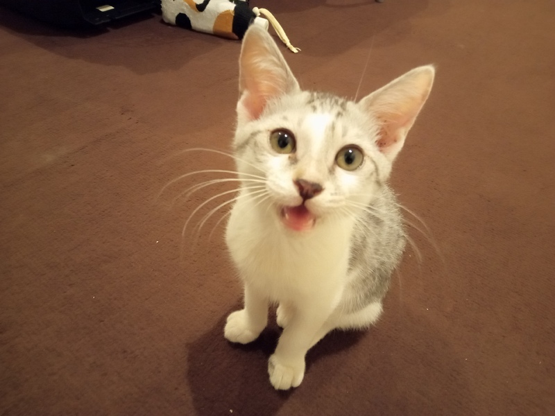 | 特徴(性格など) | キジシロとサバシロの間くらいです。 手足とお腹は白いです。 やんちゃで活発、好奇心旺盛。 ボールを追いかけて走り回り、タワーによじ登り、遊んで食べてグーグー寝ます。 |