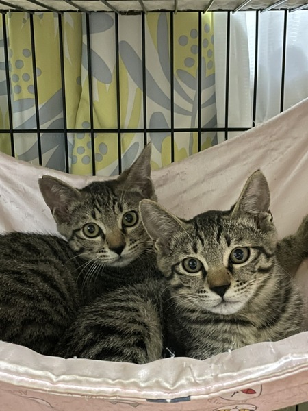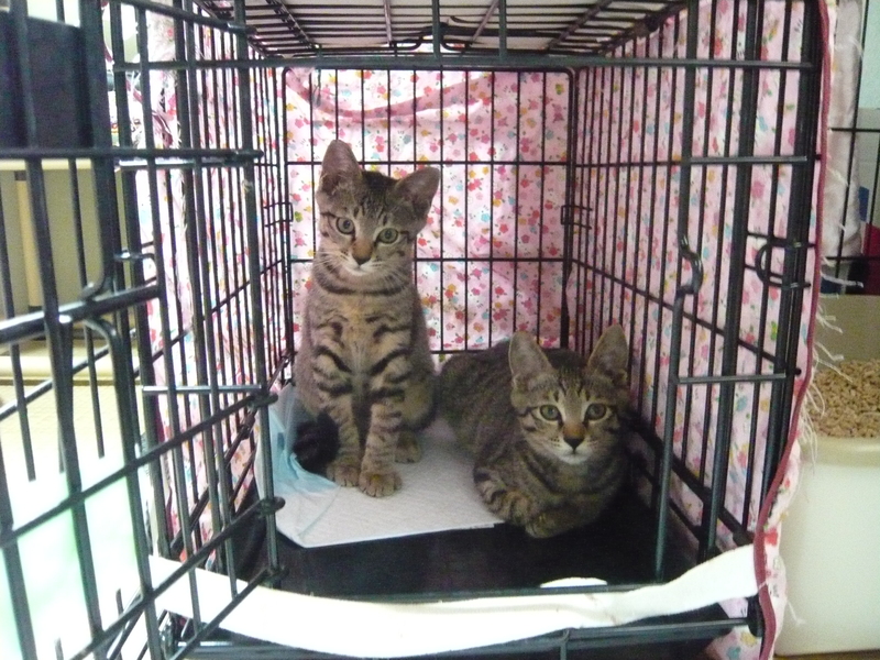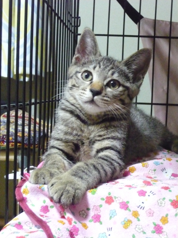 | 特徴(性格など) | 小さく耳カットしてあります。 一見そっくりで見分けがつきにくいのですが、少し大きい方を兄ちゃん、小さい方を弟くんとしています。 保護当時はどちらも挨拶代わりにシャーシャー言ってましたが今はほとんど言いません。 とても仲良しですが性格は違いまして、出てくる方と一旦引っ込む方に分かれます。 ゴハン待ちの時に出す、小さい声が可愛いです。 今までの野良猫生活のせいか、昼間は眠そうで夜中に2匹でとても激しく遊んでいます。 怖いけどオモチャの誘惑には勝てない子猫っぽいところが、それはそれは可愛いのです。 スリスリゴロゴロの道のりは遠いですが、攻撃性はありませんしケージ飼いから(特に弟君は慎重派です)焦らずゆっくり慣らして下さる飼い主さんを募集しています。 ●兄ちゃん:ほんの少し色の薄いキジトラ よく食べよく遊び、兄弟でも手前にいる事が多くキャリーの上でも1匹で寝たり新しい物への馴染みも早く、ご飯前はケージの扉の前でニーニー言って待ってます。 ジャラシで遊んでる最中に触る練習をしようとすると、手にじゃれたりするくせに触ると慌てて逃げます。 でもケージの中ですし、すぐジャラシに戻るのでその繰り返しです(笑) 噛んだり引っ掻いたりしないので、ジリジリ逃げようが、そーっと撫でて馴らしています。 触るとゴロゴロ言って日々慣れ度アップしています。近くにも寄って来ますし、活発で遊び好き、猫も大好きです。 ●弟くん:兄と比べると少し黒っぽいキジトラ 並ぶと少々小柄です。 玩具で遊びたい!ご飯食べたい!という気持ちはあるのですが怖くて引っ込んでしまい毎回兄ちゃんより遅れがちです(^^;) 私が見てないとさっさと食べてます。 猫が好きで私がいるのに無視して我が家の猫を呼んでたり、今回募集はしてませんが足の悪い妹ネコとよく一緒にいて、見てて微笑ましいほど面倒をよく見ています。 中々お近づきになれなかったのですが、最近は私の振るジャラシで遊んでくれて手からフードも食べてくれるようになりました。ウェットフードが特に好きで、その時は触っても逃げず、兄ちゃんより早く食べ終わって横取りしています。 兄ちゃんよりシャーが多いのですが、抱っこしてしまうと何故か脱力してしまいあまりに怖くて現実逃避してるのか?と心配になります。 兄ちゃんより怖がりなので、焦らずゆっくり慣らして下さる方を希望します。 (現在:兄ちゃんと遊びすぎたのか朝見に行くと「前足イタイ・・・」みたいにしてましたので、一旦兄弟分けてます。午後には普通にしてましたが大事を取って数日別室予定。これを機会に距離を縮められたら(^▽^)と期待しています。 ★この子たちは、ねぐらの近所の人でもほぼ見かけない位、母猫が連れて歩かずこっそり育てていました。 多忙な理由もありますが、今まで保護した子猫の中でもゴロゴロスリスリに時間がかかる印象です。 ですがどんな猫ちゃんでも馴れてくれます!今でも毎日進歩しています。 焦らずのんびりとこの子たちのペースで付き合ってくれる里親さんを募集しています。 単独でもOKですが、遊んだり、猫同士のルールを学ぶのに2頭飼いを勧めているので、ちょうど兄弟、仲良しさんですし、2頭一緒をお勧めします。 ・去勢済 ・ワクチン1回済み ・ノミダニ、お腹の駆虫1回済み ・ウィルス検査 マイナス 母猫はエイズキャリアでした 心配な方は2か月後にもう1度検査して下さい |