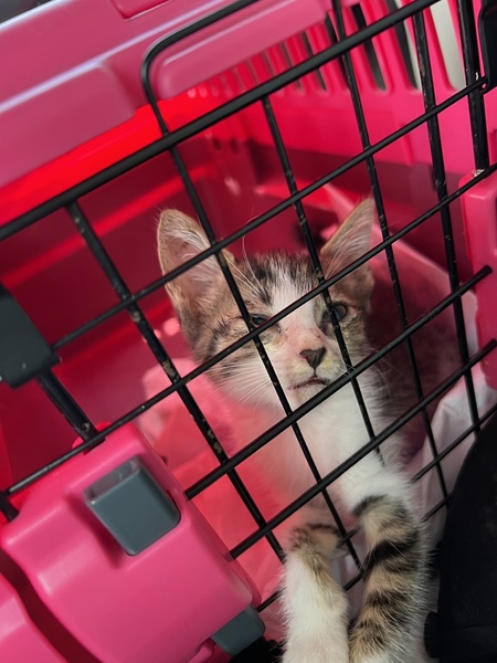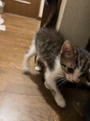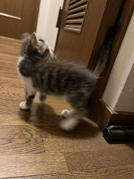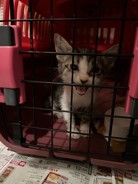 | 特徴(性格など) | 猫は飼ったことがないので分からないですが、トラ柄?だと思います。 好奇心旺盛の賢い(ゲージの鍵の場所を猫パンチしてあけようとする)猫です。 よく鳴きます。甘えています。 推定1ヶ月。6/10頃にしておきます。医師により、点滴抗生剤注射、ノミダニ駆除済み。猫用のふくので綺麗にしてあります。 |