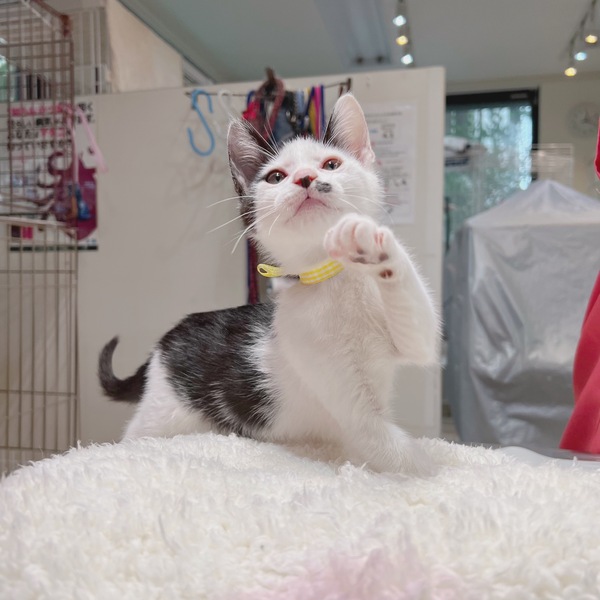 | 特徴(性格など) | 鼻のよこの黒ぶち柄と七三わけが特徴的な男の子です。 元気いっぱい食欲旺盛です。 |