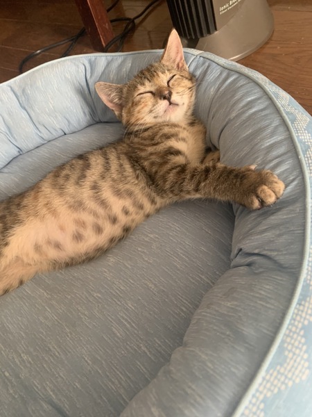 | 特徴(性格など) | しっぼの長いトラ猫です。耳と目が大きくとても可愛い顔をしています。 性格は活発、温和、甘えん坊で、他の猫達とも仲良く遊んでいます。触ると直ぐグルグルといいます。殆ど鳴きません。手のかからないお利口さんです。 |
