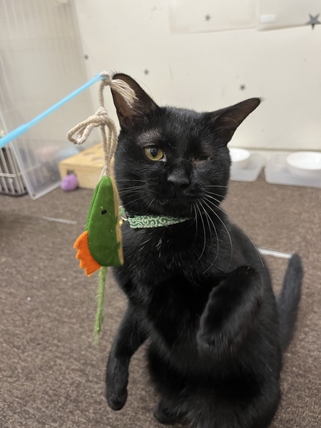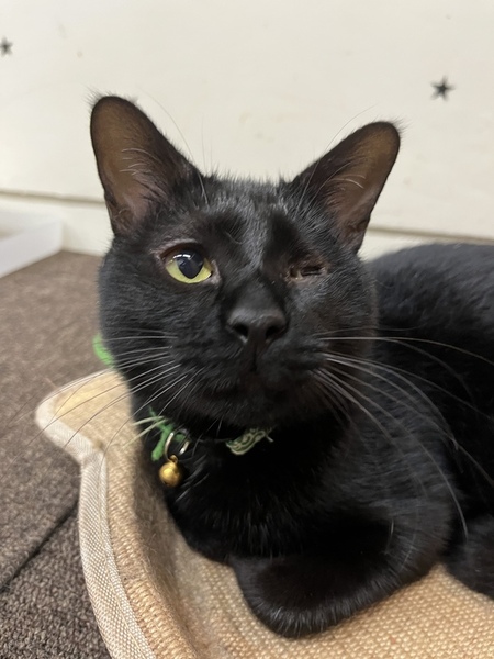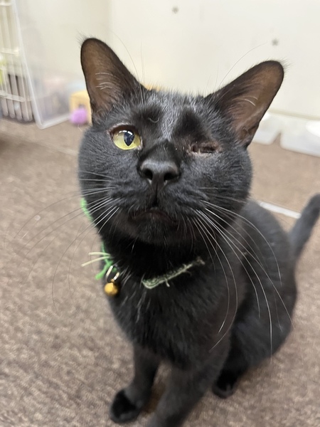 | 特徴(性格など) | 左目が保護時から眼球萎縮している黒猫ちゃんです。 とても懐っこく、遊び好きなやんちゃボーイ。 眼球萎縮については、かかりつけ獣医で本人が気にせず生活できているのであれば問題ないと言われてます。 右目はしっかりと見えており、生活に支障もなく、よく食べよく遊ぶ若々しい男の子です。 初期医療済み(以下内容) 全身血液検査 問題なし エイズ/白血病 陰性 3種ワクチン 済み 内部・外部寄生虫駆除 済み |