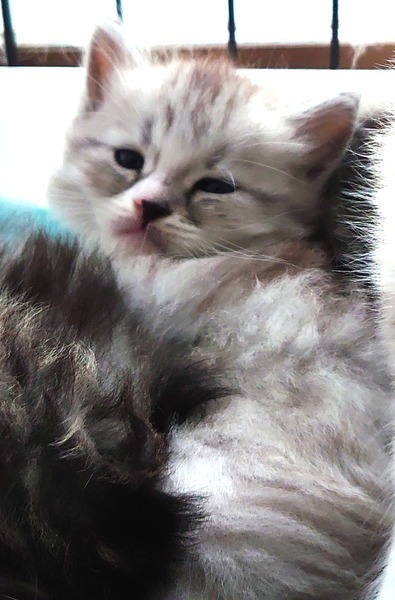 | 特徴(性格など) | 長毛のもふもふシルバータビー。瞳の色は黄緑(変わる可能性あり)。 父猫ミヌエットと母猫ミックス猫[=祖父猫ラグドールと祖母猫サイベリアンのミックス猫]のダブル・ミックスで、 顔も体もホワイト・タイガーみたいな容姿の男の子です。 多頭飼いで育ったので、人だけではなく、猫にもよく馴れています。 異なる猫種間のミックスですので、血統書はありません。 ペットではなく家族として飼ってください。特にサイベリアンは犬的な性格もあり、家族思いで、飼い主が冷たいと早死にするとも言われています。サイベリアンの血が1/4のこの子でできるかどうかはわかりませんが、サイベリアンにボール遊びを教えれば、犬のようにボールを取って来るそうです。 動き回ってなかなか写真が撮れませんが、撮れたらまたアップロードします。最後の写真はパパ猫の長足ミヌエット(ホワイト&クリーム)です。こんな感じのモヘア風の超長毛になる可能性大・・・だと思ったのですが、銀ちゃんの毛の感触がモヘアというより、ラグドールのベルベット/ビロードの毛質に近くなってきました。(ミックスのママ猫はラグドールの毛質です。)ラグドールは毛玉ができにくく、毛もあまりもつれません。銀ちゃんも、毛があまりもつれないかもしれません。 *毛色の遺伝子に興味がある方に: なぜ白系ミヌエットと、ブルーポイント(実際にはブルー=灰色)のラグドールとサイベリアンから、元祖サイベリアン系の黒や茶色の猫が出たのかについては、ブルーポイントの黒(シールポイントでは茶)と黒(茶)抑制遺伝子が関係しています。黒と黒抑制遺伝子が重なって初めてブルー(灰色)になります。 なので、ミヌエットの白系遺伝子がラグドール・サイベリアンの黒(茶)の遺伝子と交わると子猫は黒(茶)に、ミヌエットの白系遺伝子がラグドール・サイベリアンの黒(茶)抑制遺伝子と交わると子猫はシルバーになります。 |