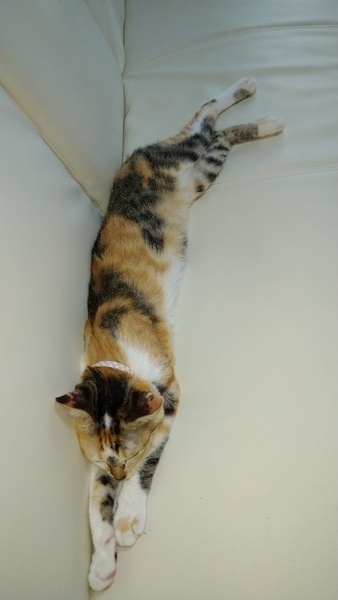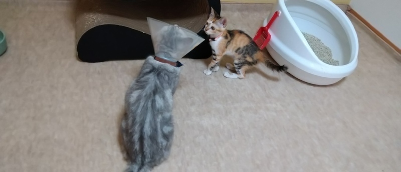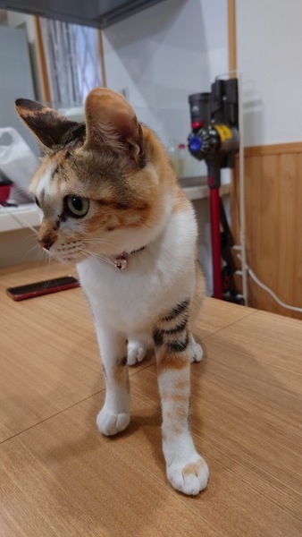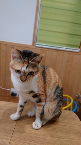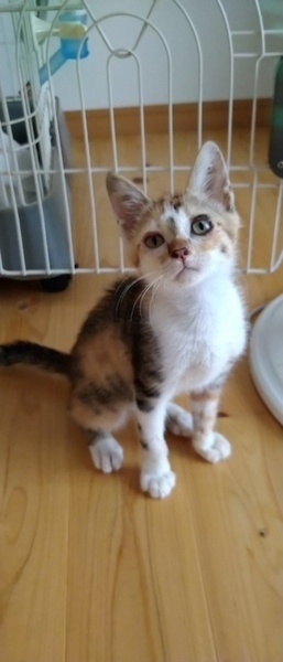 | 特徴(性格など) | 甘えん坊の三毛の仔猫の仔猫です。 昨年近所に一匹でいたところを保護しました。 最初は警戒していましたが、すぐ人間にも慣れ、5歳と2歳の子供にも絡む程人間好きになりました。 トイレも覚えました。 |