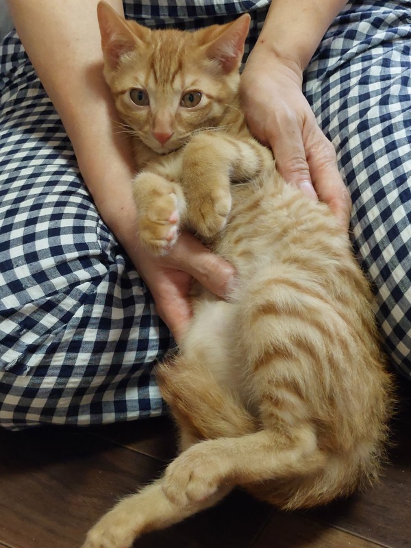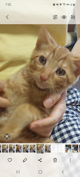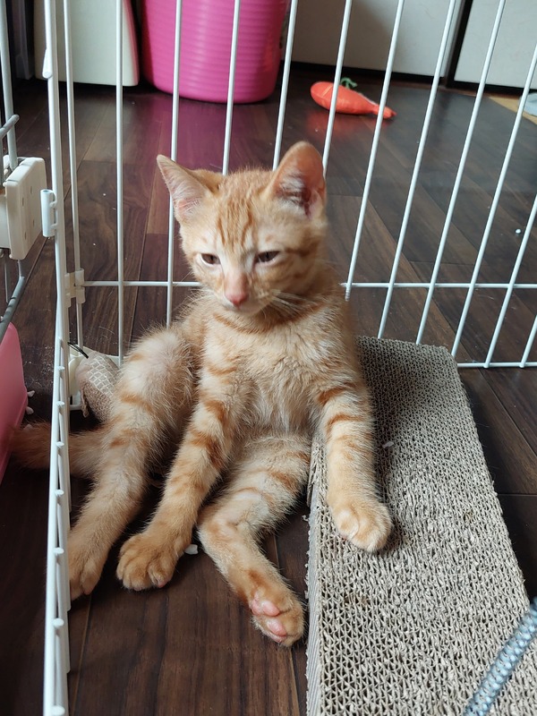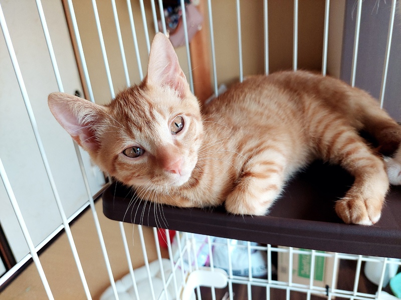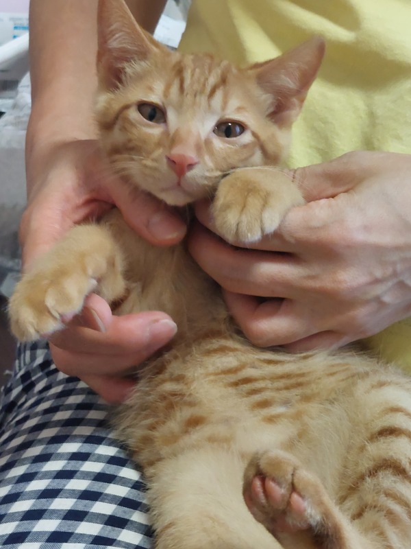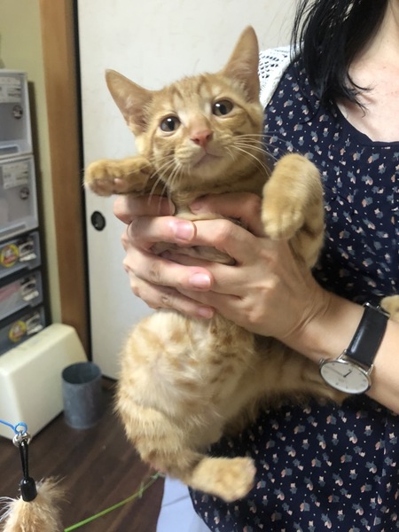 | 特徴(性格など) | 全身茶トラの可愛い男の子です。 最初は人見知りですが、慣れるとゴロゴロで腕のなかで寝ます。 遊びも大好きです。 少し天然で陽気な茶トラの男の子をぜひ可愛いがってください トイレOK カリカリOK ワクチン2回接種済み エイズ、白血病とも陰性です |