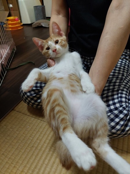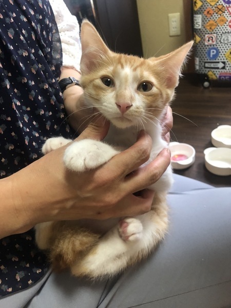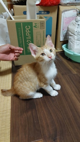| 特徴(性格など) | 茶シロ。 のんびり。マイペースな男の子です。 兄弟猫が遊んでても一人で遊んだり。 混ざって遊んだり。 マイペースで少し天然おっとりの可愛い男の子です。 あまり鳴きませんが、慣れると可愛い声でおねだりします。 カリカリOK トイレOK エイズ、白血病とも陰性 |