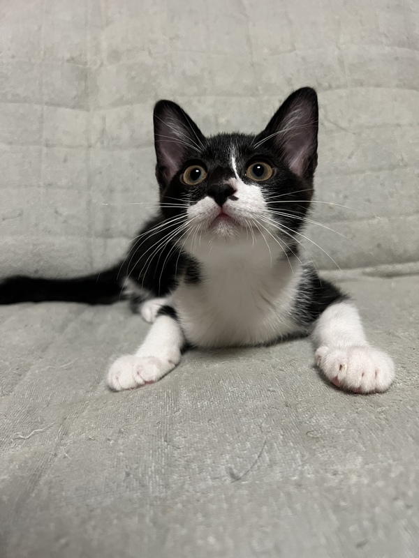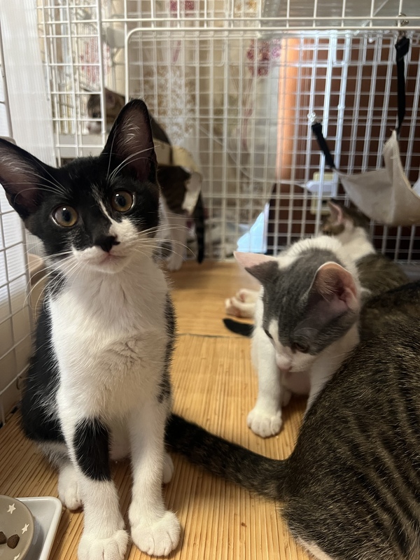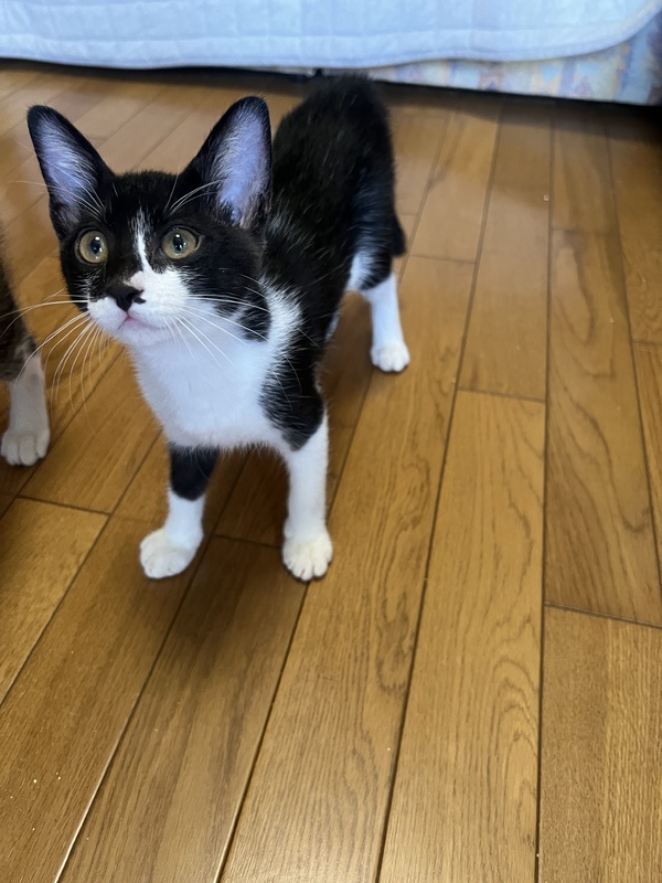 | 特徴(性格など) | 毛色:黒白 特徴:個性的な模様と白いおヒゲ しっぽ:長くて先が鍵しっぽ 性格:5匹の兄妹のうち唯一の女の子ですが、男の子に負けないくらい元気です!よく母猫さんに甘えています。 良好。 離乳:済 トイレトレーニング:済 猫エイズ:陽性(6月20日検査済) 兄妹・お母さんと毎日元気いっぱい遊んで過ごしています。 |