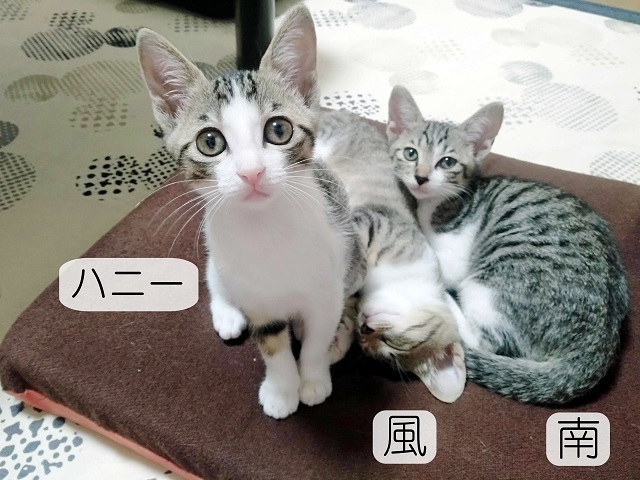 | 特徴(性格など) | ☆☆☆ご希望の方は、以下のアンケートフォームにご記入の上、送信してください☆☆☆ ねこ親希望アンケート→ http://chibawan.net/contactform_cat 【猫No】 3524 【愛称】 ハニー 【性別】 メス 【年齢】 推定2ヶ月(22/07/26現在)(22/05下旬生) 【毛色】 キジ白 【体重】 1.0kg(22/07/26現在) 【状態】 ワクチン1回接種済(22/07/24)、血液検査(エイズ-・白血病-)、ノミダニ駆除済、駆虫済、トイレ躾済 【預かり場所】 千葉県船橋市 【日記】 https://www.instagram.com/jasmine81865/ Instagram 【経緯】 千葉県動物愛護センターより引き取り 【性格】 兄弟妹3匹で保護されました。ミルクから育てていますので人が大好きです。 好奇心旺盛なお転婆さんです。キャットタワーも一番に登れるようになりました。 目が大きくてクリクリしている美少女です。 とても人懐こくてお膝に乗るのも抱っこも大好きで撫でられるとゴロゴロと言います。 ニャンプロしたりおもちゃを追いかけたり仲良し3兄弟妹で元気に遊んでいます。 お留守番も出来ますし、夜はケージで大人しく寝るお利口さんです。 【補足事項】 兄弟猫の南・風(キジ白・オス)と一緒にお迎えして下さるねこ親さんを募集します。 仲良しの兄弟と一緒ならお留守番も寂しくなくて安心です。 ※2匹もしくは3匹同時にお迎え下さるご家庭を優先させて頂きます。 ※1匹のみご希望の場合は一緒に遊べる先住猫さん(2歳位まで)が いらっしゃるご家庭のみとさせて頂きます。 大変申し訳ございませんが、仔猫のためお一人暮らしやご高齢の方のみのご世帯はお申込みをお断りさせて頂きます。 また長時間お留守をされるご家庭の場合も、条件によってはお申し込みをお断りさせていただく場合がございます。 ※お試し生活は、不妊去勢手術などの医療処置が全て完了してからとなります。(8月下旬頃予定) 【その他】 愛情いっぱいの終生飼養、ネコにあった生活スタイル、完全室内飼育、脱走・迷子防止対策、定期的なワクチン接種などの健康管理をお約束いただける 千葉県船橋市から1時間以内のご家庭で、アンケートに快くお答えいただける方からのお問い合わせをお待ちしています。 |