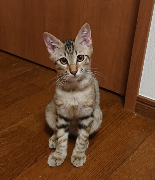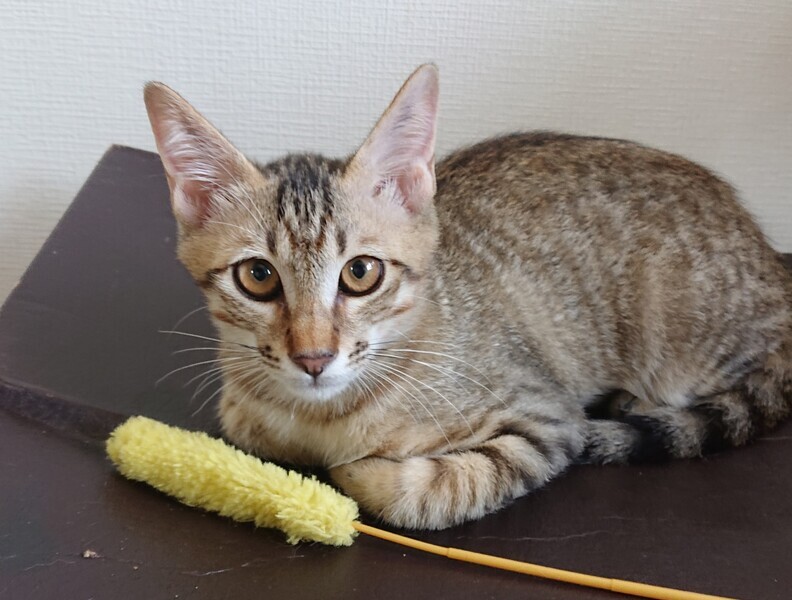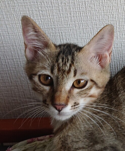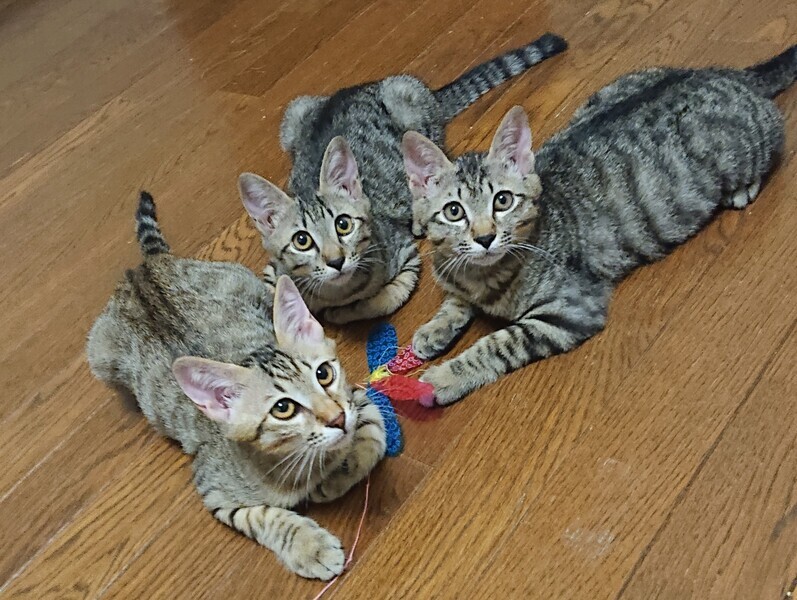 | 特徴(性格など) | ☆名前「しん} ☆少し薄い色のキジトラ(3匹の写真の左側の子) ☆初回ワクチン済み、エイズ白血病ウイルス検査済み(両陰性) 検便駆虫済み ☆性格 兄妹の中で一番人慣れしています。 初対面の人は最初少し警戒しますが、しばらくすると甘えてきます。 活発でおもちゃでアクティブに遊びます。 先住猫ともよく遊びます。 |