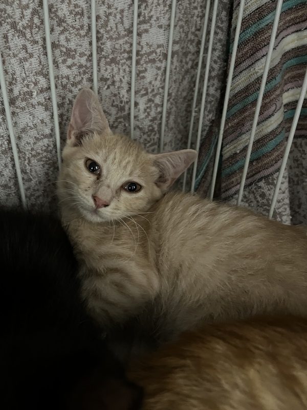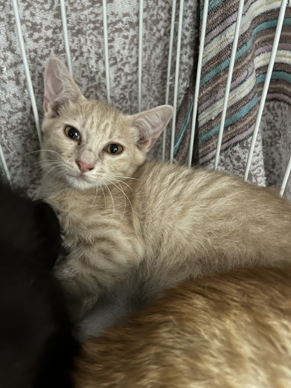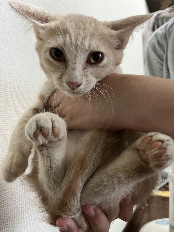 | 特徴(性格など) | クリーム色の茶トラくん 性格はちょっとビビりで優しい子。触ろうとすると初めはシャーとは良いますが、決して噛んだり手を出したりはしません。 抱っこするとずっと大人しくしています。チュールは抱っこされたり手からも食べます。 顎を撫でると気持ちよさそう。ちょっとタレ目? トイレOK。猫にはフレンドリーです。 保護から3週間たち、人慣れまでちょっと!とまだまだしっかり触れるまでには多少時間がかかるかもしれませんが、それでもと言って下さる方、ぜひ幸せにしてあげて下さい。 徐々に慣れてきています。 |