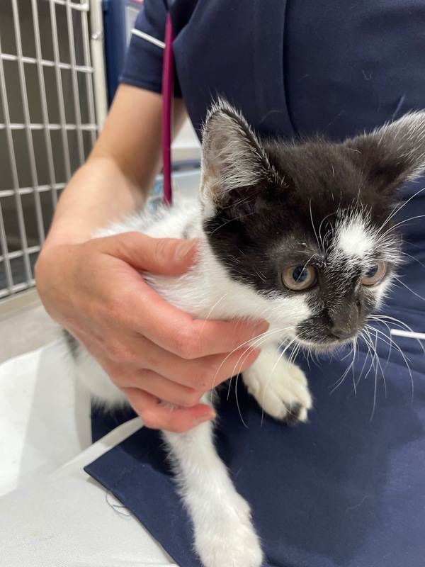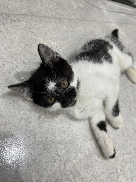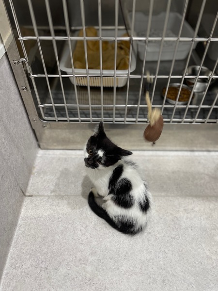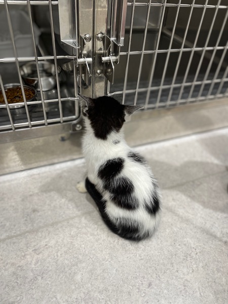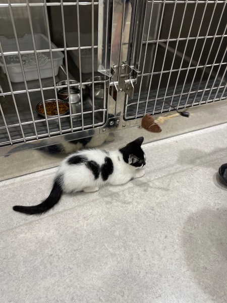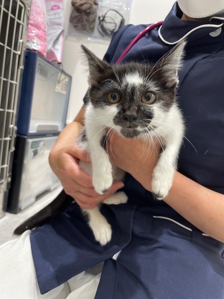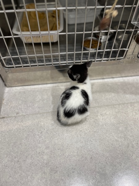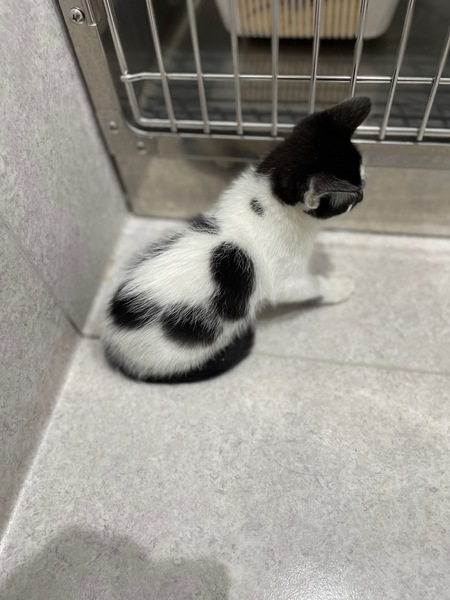 | 特徴(性格など) | 保護時お腹をケガしていましたが、治療済で現在は元気いっぱいです 食欲もあり、治療のため剃ったお腹の毛も生えそろってきています 黒白模様のなんとも珍しい柄の男の子です おでこに白い丸があり、背中はお花のような模様があります 体重は1.2kg、尻尾は黒一色でまっすぐです 性格は人懐っこく甘えん坊さんで他の猫とも仲良くしています 夜は静かに寝てくれて、無駄鳴きのない良い子です フードはドライ、ウエットなど何でも食べてくれてトイレも問題ありません |
